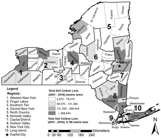 Recent developments in NYS, between 2001 and 2016, generated a midpoint total of 6.6 × 109 kg in C losses, which would require removal from the atmosphere. All NYS counties and regions experienced GHG emissions from developments between 2001 and 2016. Counties with some of the highest soil C losses were Suffolk County (6.0 × 108 kg C) and Orange County (5.2 × 108 kg C) near NYC, and Saratoga County (4.8 × 108 kg C) near Albany (Figure 4). The Hudson Valley region near NYC had the highest C loss (2.0 × 109 kg C), followed by the Capital District (1.1 × 108 kg C), which includes Albany. This geospatial analysis shows that GHG emissions are driven by land development near existing urban areas.