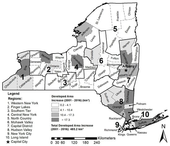 Recent developments from 2001 to 2016 totaled 485.2 km2. The developed area ranged from 42.9 km2 for Suffolk County to 0.2 km2 for Hamilton and Schuyler Counties. Counties with some of the highest development area losses were Suffolk County (42.9 km2) and Orange County (37.4 km2) near NYC, and Saratoga County (37.2 km2) near the City of Albany (Figure 5). The Hudson Valley region near NYC had the highest developed area (138.9 km2), while the New York City region had the lowest amount of newly developed land (12.5 km2, Table S4), likely because of the existing high level of development in this area.