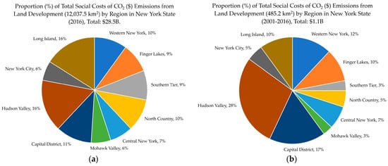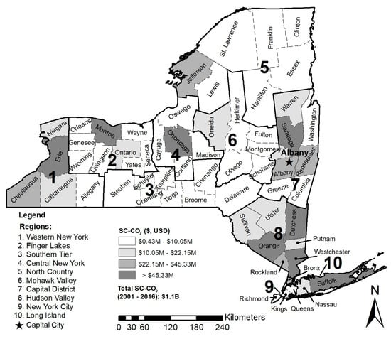 Recent developments from 2001 to 2016 generated a total cost of $1.1B SC-CO2. It is important to note that this estimate of social costs may only represent a small fraction of the actual liability given the actual market-based costs of climate change disasters. The SC-CO2 ranged from $102.2M for Suffolk County to $433,297.7 for Schuyler County (Figure 6). Counties with some of the highest SC-CO2 were Suffolk County ($102.2M) and Orange County ($87.8M) near NYC and Saratoga County ($81.6M) near the City of Albany. The Hudson Valley region near NYC had the highest SC-CO2 ($331.3M), while the Southern Tier region had the lowest SC-CO2 ($37.1M, Table 9). Although the SC-CO2 can be calculated for NYS, there is currently no regulatory mechanism (e.g., “polluter-pays-principle,” PPP) to assign these costs to a liable party, so none of these costs are collected in a regulatory or voluntary fashion. If collected, these costs could be assigned as part of the development process, and the funds collected could be used for C sequestration and/or compensation funds at the local, state, country, or even global scale (e.g., Warsaw International Mechanism, WIM, etc.) [22,23,24,25]. Geospatial analysis helps visualize and understand where these development activities are occurring in NYS and highlights areas where regulatory intervention may be necessary. Given the urgent nature of climate change, regulatory feedback (e.g., SC-CO2 of GHG emissions) is needed to help modify land development behavior.