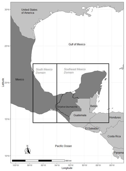 - Andrade-Velázquez, M. Visión climática de la precipitación en la cuenca del Río Usumacinta. In La Cuenca del Río Usumacinta desde la Perspectiva del Cambio Climático; Soares, D., García, G.A., Eds.; Instituto Mexicano de Tecnología del Agua: Jiutepec, México, 2017; pp. 1–417. [Google Scholar]