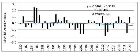 The seasonal rainfall anomaly index (RAI) was computed for the period 1980–2020. The rainfall anomaly index (RAI) classification based on [40] was used for MAM and JJAS seasons at the Babile station, as shown in Figure 2 and Figure 3. There was notable high seasonal variability and temporal anomalies in rainfall within the specified time period (Figure 2 and Figure 3). The positive RAI values represent normal to wetter rainfall conditions, while the negative values represent dry to very dry seasons, with different degrees of intensity. As shown in Figure 2, the periods that had the longest drought periods during the MAM season were 1982–1984, 1988–1992, 1998–2003, and 2011–2014. In particular, the highest negative value, with an RAI of −2.0 during the MAM season, was observed in 2011. The same year with a severe drought event was also documented in [40]. In contrast, the years with the greatest positive value of RAI during the MAM season were 1985 and 1986, with RAI of 2.5 and 2.4, respectively. Based on [40] rainfall anomaly index classification, these years were classified as very wet (Figure 2). Although it seems that the MAM rainfall anomaly has decreased, the trend line did not show any statistical significance.