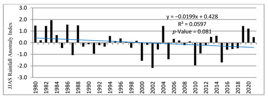 Based on [40]’s drought intensity classification, the moderate drought intensity years indicated in Figure 3 during JJAS were 1987, 1991, 2000, 2005, 2011, and 2015, while the extreme droughts occurred in 2002 and 2010, which were the years with the highest negative value of RAI during JJAS, with an RAI of −2.1 and −2.0, respectively, classified as severe drought years. Here, the periods that had the longest droughts during JJAS season were from 1989–1993, from 1998–2005, from 2008–2012, and from 2015–2018 (Figure 3). Here, once the drought has occurred during JJAS, it lasts from four to seven years. On the other hand, the year of greatest positive values of RAI during JJAS were 1980, 1983, and 1988, with an RAI of 1.5, 1.9, and 1.5, respectively, being, therefore, classified as very wet (Figure 3). Although it seems that the JJAS rainfall anomaly has decreased, the trend line did not show any statitistical significance.