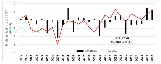 Furthermore, sorghum yield anomaly was computed from 1995–2020 and synchronized with the JJAS seasonal rainfall anomaly index (RAI) to analysis the impacts of the rainfall anomaly index on sorghum yield. The result revealed that the JJAS rainfall anomaly index showed positive values with the sorghum yield anomalies in 1996, 2019, and 2020, and negatively values with the sorghum yield in 1998, 2000, 2001, 2002, 2003, 2005, 2008, 2010, and 2015 years (Figure 4). Here, the RAI anomaly has a similar phase with a sorghum yield anomaly in most of the observed years (Figure 4).