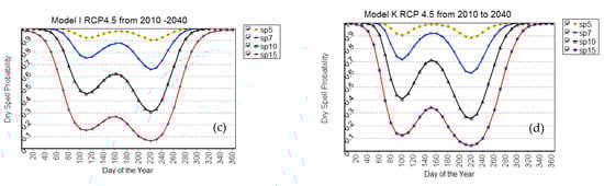 Seasonal dry spell risk analysis was made for the near-term 21st century based on climate model outputs generated from the CanESM2, GFDL-ESM2M, and HadGEM2 (CMIP5) climate projection models under RCP4.5 scenarios (Figure 5b–d). The results showed that the pattern of dry spells with specified day lengths resembled the observed events in recent years (Figure 5a) but with lower intensity in dry spell risk, from 140 to 180 days of the year as generated from the CanESM2 model output data (Figure 5b).