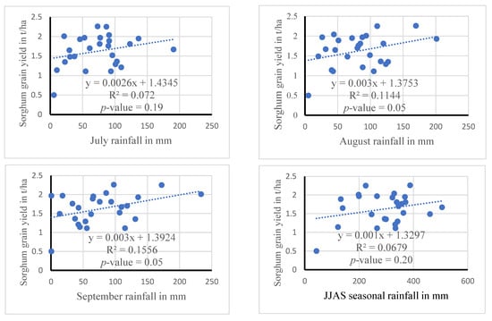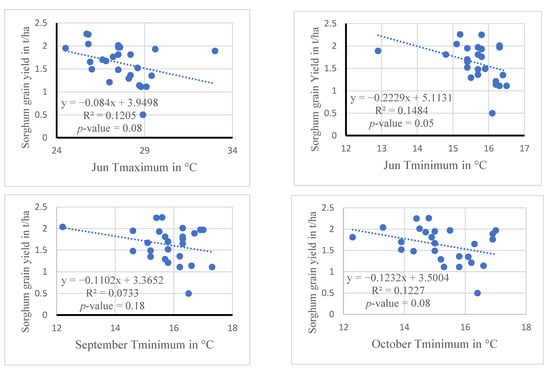 Sorghum grain yield response to inter-seasonal climate variability was examined by using climate and crop data for the period (1995–2020) in this study. Figure 6 and Figure 7 demonstrate the relationship between sorghum grain yield and month-based climate variables during the growing season separately. Even though the goodness-of-fit of the regression equations is statistically not significant at alpha 0.05, the results revealed that sorghum grain yield is weakly associated with monthly rainfall (Figure 6) and inversely proportional to monthly maximum and minimum temperature (Figure 7). As indicated in both Figure 6 and Figure 7, each climate variable did not explain the variation in sorghum yield performance separately. However, there is a tendency for sorghum crop yield to increment with rainfall while declining with an increase in temperature. This study agrees with the study carried out by [23], which also documented that sorghum crop yield is inversely proportional to the change in temperature, while grain yield is directly proportional to the change in rainfall. The adjusted R-squared statistic of multiple regression revealed that the overall effect of month-based rainfall and temperature conditions during the growing period was 76.9% (Table 8), which indicated that five variables explained 76.9% of the variation in sorghum grain yield. In contrast, 23.1% of the sorghum grain yield variation remained unknown, and could be required to explain sorghum grain yield variability in the study area.