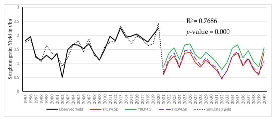 The multi-regression model based on climate variability was constructed as follows: sorghum yield in t/ha = 7.66 − 0.361JunTmin + 0.0014GDDMN − 0.171JunTmax + 0.00374AugRF + 0.028SepNRD. In this multiple linear regression equation, the projected climate data from three GCM model outputs, namely GFDLESM2M(I), CanESM2(D), and HadGEM2-ES(K) (CMIP5) under the RCP 4.5 climate scenario, were used separately to make the sorghum grain yield prediction for the near-term 21st century (2020–2040). However, the line graph of the observed years from 1995–2020 of sorghum grain yield variability shows upward and downwards trends. The trend tested by the Mandel–Kendall method showed a Z value of 3.42 and a sense slope of 0.0363 with a p-value of 0.00063, which showed an increasing trend is statistically significant at an alpha less than 0.05, but in the prediction time period from 2020–2040 it was shown to be decreasing relative to observation trend. A comparable study in Ethiopia showed an increased trend of rain-fed sorghum production from 1993–2019 [67].