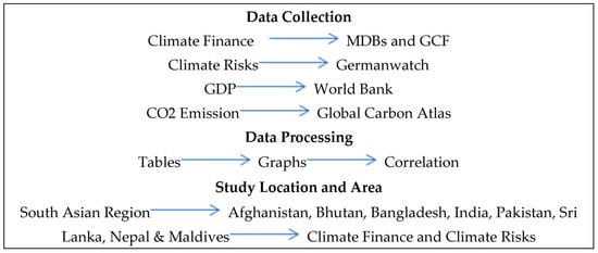 The study considered all eight countries (Afghanistan, Bangladesh, Bhutan, India, Maldives, Nepal, Pakistan, and Sri Lanka) of the SA region. Therefore, the study used eight countries’ climate finance and climate risk, carbon emission, and GDP data for the analysis. This is country-level research; therefore, the study considered analytical and statistical tools for the empirical findings and conclusions, along with different graphs and tables. A correlation matrix was drawn to find the association between climate finance, climate risk, gross domestic product growth (GDPG), and CO2 emission. In the correlation analysis, we considered the 2015–2021 panel data based on the availability of MDB climate finance data, Germanwatch climate risk data, GDPG, and CO2 emissions. The study used SPSS 22 version for the correlation matrix. Figure 1 provides the method of the study.