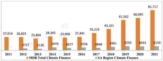 Figure 2 presents the total climate finance of MDBs from the years 2011 to 2021. The figure also represents the SA region’s climate finance by MDBs. The figure shows an upward trend in MDB finance. During the period, the highest and lowest financing levels are in the years 2021 and 2013, respectively. On average, MDBs financed USD 40,634 million. Compared to 2011, MDBs’ investment increased by 202% in 2021, revealing a significant contribution to global climate finance. Moreover, MDBs did not disclose regional climate finance data for the year 2011. The figure also exhibits the post-COVID-19 climate finance picture of MDBs, which is very satisfactory. On the other hand, the SA region’s financing is also increasing over time while the average climate finance is 13% of total MDBs’ climate finance (USD 5391 million). The SA region’s access to MDB climate finance increased by 119% compared to 2012 and decreased by 3% compared to 2018. Interestingly, SA region climate financing decreased in 2017 while it increased dramatically globally. Regarding the COVID-19 period, SA region climate finance drastically reduced in 2021; globally, total finance increased by 24% (that of the SA region increased only 1.5% from 2020). The picture vividly expresses that SA countries are enjoying a lower amount of climate finance from the MDBs concerning climate risk and vulnerability. Our analysis is consistent with that of Atteridge and Canales [] and Carrozza [].