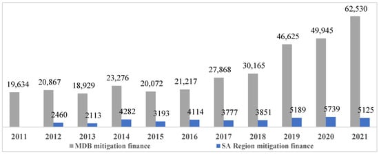 Figure 3 shows the mitigation financing of MDBs and the SA region from 2011 to 2021. The figure points out that mitigation finance was higher than other financial mechanisms. MDBs contributed 77% of their total climate finance (USD 341,128 million) to mitigation projects. MDBs’ total mitigation financing increased yearly, with 2021 having the highest contribution. The average mitigation finance was USD 31,012 million. MDBs did not disclose regional mitigation climate finance data for the year 2011. Moreover, the figure shows an increasing trend of mitigation finance after COVID-19 that contributes to the climate risk strategy. During the period, SA region countries received a total of USD 39,843 million, an average of 12% mitigation finance from the total MDBs’ mitigation contribution and 9% of total climate finance. SA region mitigation finance changed yearly, and the highest mitigation finance was in 2020. Moreover, mitigation finance had decreasing trend in the SA region since 2019, which is very alarming. The results also show that the maximum amount of climate finance was being used to reduce the region’s carbon emissions and vulnerability to the climate. Moreover, mitigation finance directly improves technological innovation, renewable energy production, low-carbon technology, energy efficiency, waste management, and a cross-cutting issue that directly and indirectly mitigates CO2 emissions. The result of this study is consistent with the prior research of Steffen and Schmidt [] and Carrozza [].