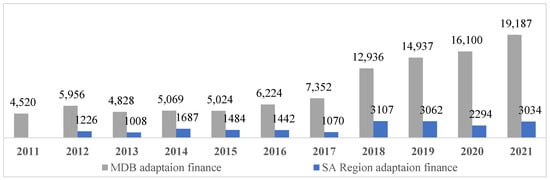 Figure 4 presents MDBs’ total and SA region adaptation finance data from 2011 to 2021. MDBs financed a significant amount in the adaptation areas, indicating a promising commitment against climate risk. MDBs’ total adaption finance is USD 102,133 million which is 23% of MDBs’ total climate finance, and average finance is USD 9285 million. Moreover, MDBs did not disclose regional adaptation climate finance data for the year 2011. MDBs’ adaptation finance shows an increasing trend, with 2021 as the maximum financing year. On the other hand, the SA region, on average, received USD 3530 million, which is 33% of total adaptation finance in the SA region and 4% of MDBs’ total climate finance. MDBs’ adaptation finance in the SA region decreased by 2% compared to 2020. Adaptation finance is used to mitigate physical hazards, including in the built environment and infrastructure, institutional capacity development, agricultural production, coastal infrastructure, and financial services. Since 2012, the SA region received the lowest adaptation financing in 2020 (only 10%). The findings are consistent with the regional climate change reports of Zou and Ockenden [] and Carrozza [].