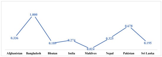 Table 4 presents long-term climate risk in the SA region from 2012 to 2021 (Germanwatch prepares a long-term climate risk index based on the last twenty years of physical damage due to weather and natural disasters. For example, the 2012 climate risk index measures the damage between 1991 and 2010). According to Eckstein et al. [], the long-term climate risk index indicates that countries with a lower score are highly climate risky in terms of physical damage due to weather/natural disasters. Among the eight countries, Bangladesh is in the most vulnerable and dangerous position in terms of the long-run climate risk, whereas Pakistan and Nepal are ranked second and third, respectively. Afghanistan and India are fourth and fifth in terms of long-term climate risk, and their average scores are 38 and 46, respectively. Interestingly, the Maldives received the highest score and ranked eighth in the region, meaning less climate risk due to physical damage.