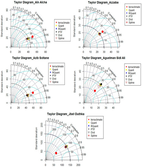 To correct the biases in the precipitation estimated by TC compared to the observed data, the quantile mapping method is used by the station and for the monthly data set. To do this, we used the “qmap” package developed in R [37]. The robustness of the five bias correction methods (Table 2) was evaluated using the Taylor diagram (Figure 2).