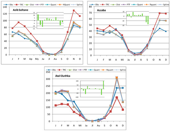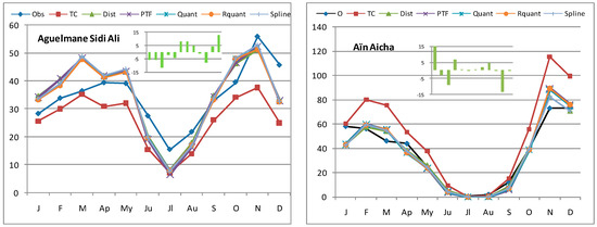 After the correction of the bias by the five quantile methods, we note their significant correction efficiency, which, however, varies across the stations, with no one method being clearly better than the others. Thus, we calculated the average of the monthly precipitations estimated by the five methods that we compared with the observed values. The results are presented in the form of histograms inside the figures (Figure 3). Negative deviations indicate underestimation by bias correction methods, while positive deviations show the opposite. For the first four stations, the maximum deviations are +/−15 mm, while they are between -70 and +100 mm for the Jbel Outhka station. This large difference is explained by the smaller scale pluviometric contributions that this mountain station receives compared to the others.