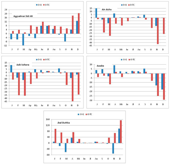 PBIAS (in %) measures the average tendency of estimated data to be larger or smaller than their observed data [35]. The sign, positive or negative, shows, respectively, the bias of overestimation or underestimation by the TC data. At high altitude stations (i.e., Aguelmane Sidi Ali, and Jbel Outhka), rainfall is underestimated for all months of the year. This result confirms the difficulty of TC data to take into account the orographic effect in the genesis of rainfall. On the other hand, the estimates of the monthly precipitations at the level of the stations Aïn Aïcha and Azib Soltane, which are marked by their latitudinal and topographical similarities, are divergent: monthly rainfall is generally over-estimated in Aïn Aïcha and under-estimated in Azib Soltane. The Azzaba station, located in the foothills of the Middle Atlas, shows a great similarity in these PBIAIS results with the Aïn Aïcha station. The hot season rains from June to July are underestimated. Thus, the convective processes responsible for summer rains, especially in the mountains, are not sufficiently well taken into account in the TC data.