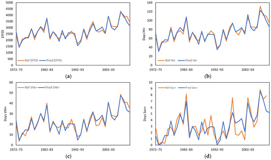 Comparison of reference and predicted measures of the FFDI from 1972–73 to 2009–2010 for: (a) ΣFFDI, (b) Days Hi+, (c) Days VHi+, and (d) Days Sev+.