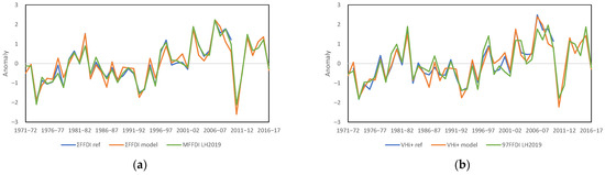Comparison of predicted ΣFFDI for South West Western Australia with inputs from (a) the BoM high quality data for 1957–2021 fire years; (b) the LH2019 data for the 1971–2016 fire years.