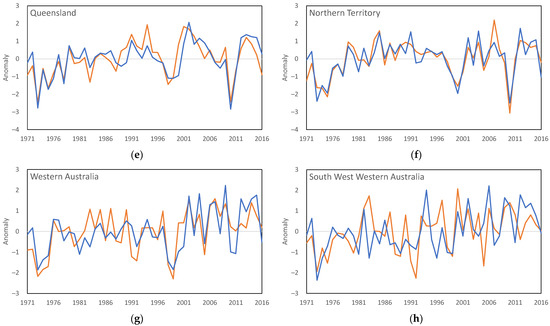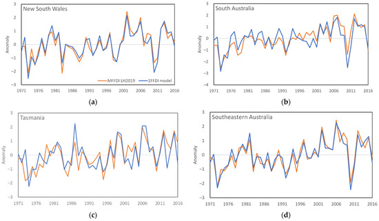 The longer time period for the HL2091 data covers the training period and an additional 8 years (1971, 2010–2016). Station data from the LH2019 data set were averaged for each state and territory and compared those with the HQD FFDI. Anomalies were used to allow for the different measures of the FFDI in each. The results were influenced by the distribution of climate stations across each region.