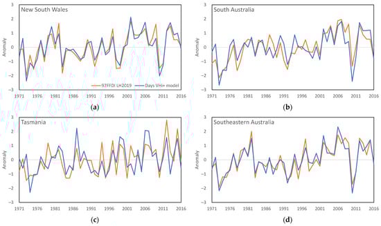 Comparison of predicted Days VHi+ with the 97th percentile annual FFDI from 1971–1972 to 2016–2017 for: (a) New South Wales, (b) South Australia, (c) Tasmania, (d) Southeastern Australia, (e) Queensland, (f) Northern Territory, (g) Western Australia, and (h) South West Western Australia.