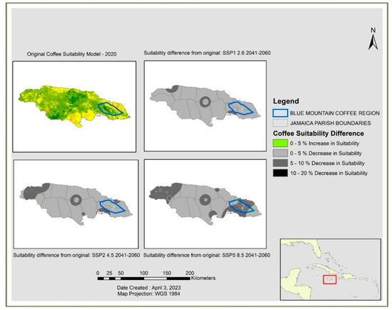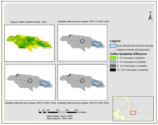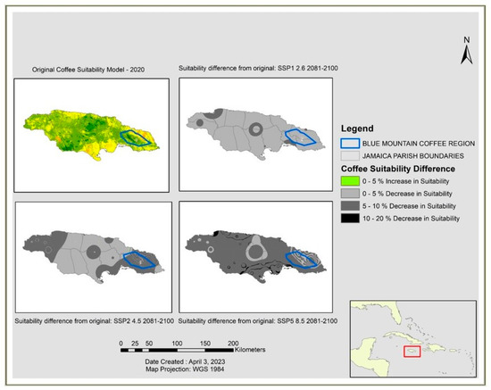 Jamaica produces one of the most expensive coffees on the global market. The local specialty coffee industry plays a significant role in the island’s economy and also contributes to the livelihood of smallholders—the majority of whom operate the industry’s coffee farms. While climate model projections suggest that Jamaica will continue to experience a warming and drying trend, no study has assessed the future impacts of changing climatic patterns on local coffee-growing areas. This research developed a number of geospatial processing models within the ArcMap software platform to model current coffee suitability and future crop suitability across three Shared Socioeconomic Pathways (SSP1-2.6, SSP2-4.5, and SSP5-8.5) and three future time periods (2021–2040, 2041–2060, and 2081–2100). The results validated current locations of coffee production and revealed that there was an observable decrease in coffee suitability across the island, across all SSP scenarios and time periods under study. Most growing regions were projected to experience declines in production suitability of at least 10%, with the most severe changes occurring in non-Blue Mountain regions under the SSP5-8.5 scenario. Implications of this projected suitability change range from decreased production volumes, increased price volatility, and disruption to market operations and livelihood incomes. The paper’s findings offer stakeholders within Jamaica’s coffee industry the opportunity to develop targeted adaptation planning initiatives, and point to the need for concrete decisions concerning future investment pathways for the industry. It also provides insight into other tropical coffee-growing regions around the world that are facing the challenges associated with climate change.