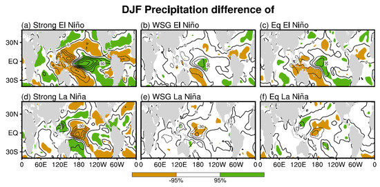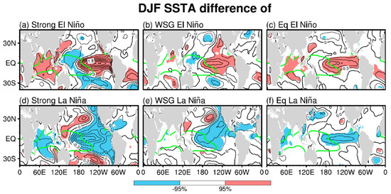 DJF sea surface temperature (SST; K, interval: 0.3 K) composite differences of (a) strong El Niño, (b) weak intensity-strong gradient (WSG) El Niño, and (c) equatorial (Eq) El Niño. (d–f) same as (a–c), but for La Niña events. The shadings in each panel represent the region with anomalies significant at the 95% confidence level (Student’s t-test). The green contour represents 28 °C isotherm.