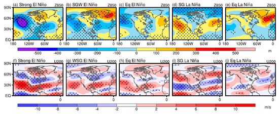 DJF 850-hPa geopotential height (Z850; m) composite differences of (a) strong El Niño—neutral, (b) WSG-El Niño—neutral, (c) Eq-El Niño—neutral, (d) SG-La Niña—neutral, and (e) Eq-La Niña—neutral. (f–j) same as (a–e) but for zonal wind at 200-hPa (U200; m/s). The dots in each panel represent the region with anomalies significant at the 90% confidence level (Student’s t-test).