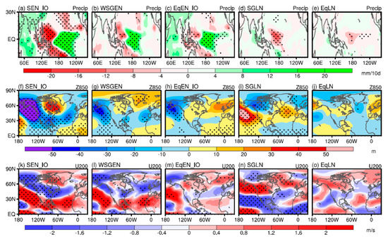 Numerical experiments were performed to identify the potential effects of westerly jets on connecting the tropical SSTAs corresponding to diverse ENSOs and NAO signals. The detailed experiment designs are listed in Table 2. Figure 6 displays the abnormal tropical precipitation, Z850, and U200 response to the SEN_IO, WSGEN, EqEN_IO, SGLN, and EqLN SSTAs forcing versus the CTRL run. In general, the simulated results can well reproduce the observational analysis counterparts. In the EN-type simulations, the prescribed warm SSTA in EP and IO with the cold SSTA in WP for the SEN_IO simulation leads to stronger tropical precipitation responses (Figure 6a) than those of the WSGEN (Figure 6b) and EqEN_IO (Figure 6c) experiments. Additionally, significant positive precipitation anomalies dominate tropical IO in the SEN_IO (Figure 6a) and EqEN_IO (Figure 6c) experiments but disappear in the WSGEN (Figure 6b) experiments. Further inspecting the Z850 responses to each EN-type SSTA forcing can reveal an enhanced AL over the NP in each anomalous Z850 field (Figure 6f–h). Over the North Atlantic region, the WSGEN SSTA forcing (Figure 6g) tends to induce a negative NAO anomaly, which cannot be seen in the SEN_IO (Figure 6f) and EqEN_IO (Figure 6h) simulations. In addition, the anomalous U200 exhibits a tripolar structure over the NP in each simulation (Figure 6k–m), and the salient discrepancies also appear over the North Atlantic region. The WSGEN SSTA forcing triggers the eastward spread of the subtropical and mid-latitude westerly jets (Figure 6l), confirming the observational result. In comparison, the two westerly jets cannot extend that far eastward, indicating the SEN_IO and EqEN_IO-types SSTAs are hard to trigger the NAO-like atmospheric anomaly through the “atmospheric bridge”—the westerly jets (Figure 6k,m).