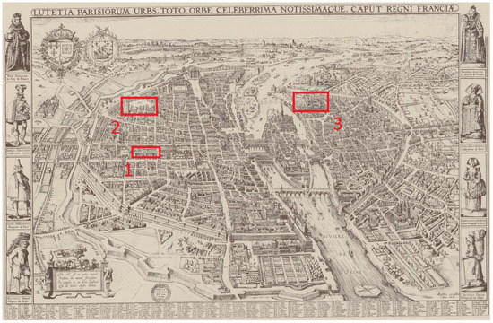 - Visscher, J.C. Lutetia Parisiorum urbs, toto orbe Celeberrima Notissimaque, Caput Regni Franciae. Bibliotheque Nationale de France, Paris. Source: Gallica.bnf.fr/Bibliothèque nationale de France. 1618. Available online: https://gallica.bnf.fr/ark:/12148/btv1b530580657.r=Paris%201618%20visscher?rk=21459;2 (accessed on 25 May 2023).
