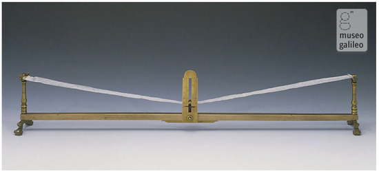 The measuring principle of Folli’s instrument works as follows: A square-sectioned wooden rod carries a small roll at each end. One of the rolls is locked and thus fixes one end of a paper ribbon, while the other end passes over the second roller. It originally supported a small (missing; see page 102 in Camuffo [25]) weight that kept the ribbon in tension. The center of the rod holds a vertical support for a decorated brass dial fitted with a circular graduated scale. On the dial, a pointer is pivoted with a pulley: the ribbon passes over the pulley and its changes in length, in response to change in atmospheric humidity, are indicated by the pointer (Museo Galilei, Florence). It is also stated that the paper tore from time to time and was later replaced by something else. Note that the measurement principle is explained a little differently in Middleton [23]. The measuring principle of Viviani’s instrument worked as follows: It was based on a strip of paper with a small ballast in the middle, forming a V, that was raised in dry conditions (i.e., flatter V) and lowered in wet ones (i.e., sharper V with deeper position of the ballast). The note “papier baisse” (paper down/decline) is very important, because it may suggest that Morin used Viviani’s or Folli’s instrument. Two translations are possible here, namely that the paper fell due to the measuring principle or that the paper ripped and consequently fell. The former translation speaks clearly for Viviani’s instrument because of two reasons: (i) the strip in Figure 3 (except the external ballast missing) always keeps the same shape either while shrinking or swelling; and (ii) the paper is not sufficiently resistant to keep a ballast heavy enough to generate friction and rotate the pivot. The latter translation speaks also for Viviani’s measuring instrument. Although the ripping of the paper may be possible for both instruments, point (ii) speaks again against Folli’s instrument. According to these reasons, we hypothesize that Morin used Viviani’s instrument. Note that for the latter, but not the former, translation, the dates on which “papier baisse” was noted are also to be seen as inhomogeneities since changes were made to the instrument.