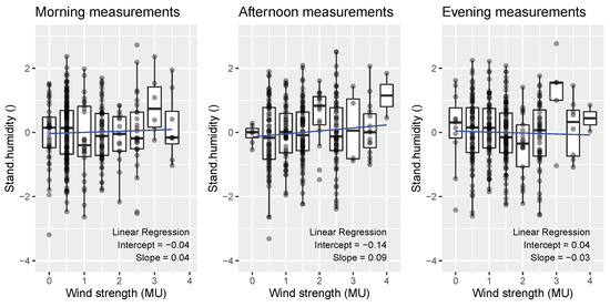 Box plots of standardized humidity measurements as a function of wind strength for the year 1707. The blue line shows for illustration the linear regression.