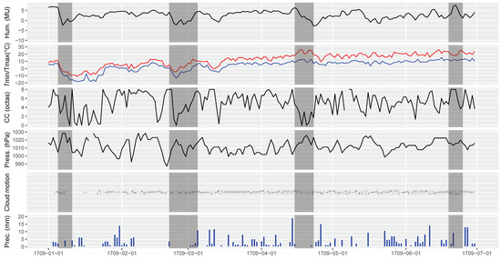 The variety, as well as the temporal resolution of Morin’s recorded climate variables, allows us to assess the hygrometer measurements using a day-by-day analysis. For this purpose, Figure 8 shows the humidity measurements in Morin’s unit, the temperature in degrees Celsius, the cloud cover in octas, the mean sea-level pressure in hPa [11], the direction of the movement of the clouds, and the precipitation in mm over the period from January 1709 to June 1709. We chose the first half of 1709 because it includes the cold winter of 1708/09. In the following lines, we analyze in more detail the time periods in which the hygrometer data undergo strong changes. These are shaded dark gray in Figure 8. In all selected time periods, the changes in the values of the hygrometer measurements can be explained on the basis of the other measurements/observations.