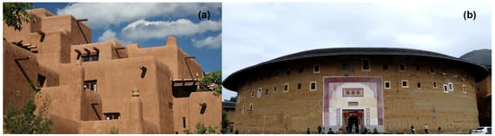 (a) Adobe pueblo in New Mexico, US (credit to Wikimedia Commons) and (b) Chinese traditional tulou (credit to Wikimedia Commons).