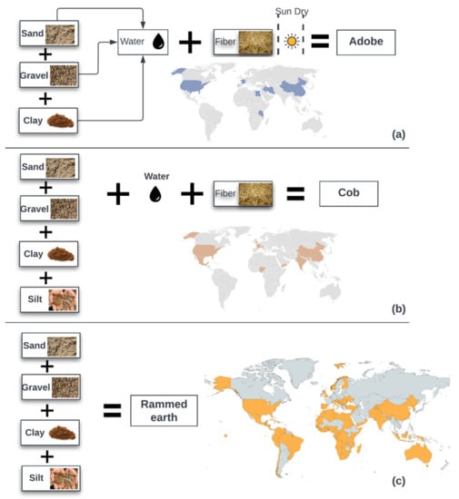 Despite the labor-intensive nature, cob construction has many advantages. Compared to rammed earth and adobe, cob performs better in terms of shear behavior; it can deform beyond the elastic range with a gradual drop in capacity; therefore, it can be considered as a seismic-resistant material [46]. In addition, research has also shown compacted cob wall with straw reinforcement can resist total failure when subjected to initial flood conditions [53]. As illustrated in Figure 2, adobe, cob, and rammed earth are often grouped together and referred to as earth construction; while sharing similarities, because of the differences of ingrediencies and construction techniques, they have different adoption and implementation around the world. Among the three, rammed earth had the widest adoption, as illustrated in Figure 2c.