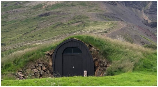 Sod refers to the layer including grass and the soil beneath held together by the grassroots [83,93]. Sod is a logical choice, probably the only viable material in the places where trees are limited, such as prairies. First, the sod strips were cut from the ground and divided into blocks, then those blocks were stacked to construct thick walls. Because of the simplicity, sod houses appear in many cultures [54], for example, the turf houses in Nordic countries. Most times, the sod blocks were left unchanged, but in some cases, the sod walls were then plastered with protective layers to increase their durability. In Nordic countries, sod walls were built above and around an excavation or partial dugout to take advantage of earth sheltering, which is an effective passive design strategy to increase the thermal property of a building. Figure 3 illustrates a traditional sod (turf) house built in Iceland. In remote areas, where modern construction materials are not easy to access, this construction can be an alternative option. However, sod construction may not be a viable solution in many locations because of limited supplies and its related environmental impact.