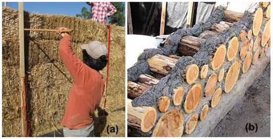 (a) Straw bale load-bearing wall, and (b) cordwood wall construction (credit to Wikimedia Commons).
