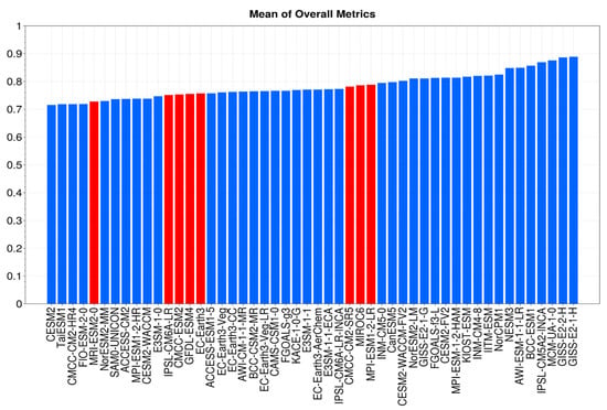 Ranked models after applying the methodology of Rupp et al. [98], obtained with monthly data from 50 CMIP6-GCMs for the historical period (1995–2014). Best performing models are located on the left-hand side of the X-axis, and red bars indicate the models selected for the study.