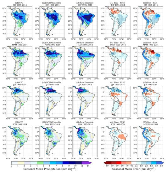 Considering the BCSD ensemble, one notices a significant reduction of biases across the continent, especially on the west coast of SA and northeastern Brazil. Despite a better representation of the intensity and location of rainfall maxima associated with the SACZ, the ensemble still overestimates precipitation at the center of the continental SACZ, which is mainly controlled by internal climate variability and has low or negligible predictability associated with SST variations [131,132].