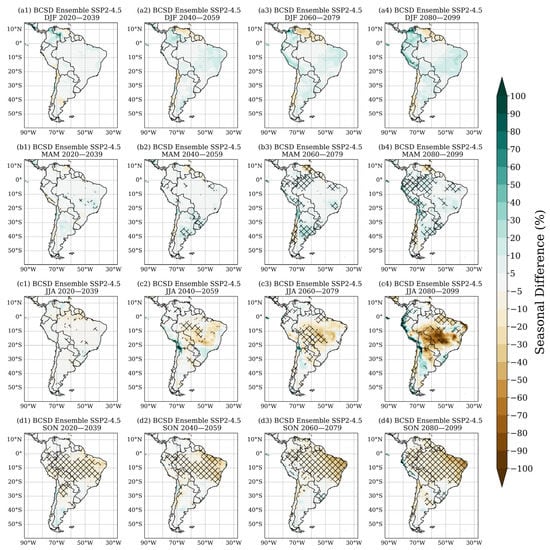 Seasonal differences of precipitation (%) between the future (2020–2039, 2040–2059, 2060–2079, 2080–2099) and historical period (1995–2014), projected by the BCSD ensemble under the SSP2-4.5 forcing scenario. Hatched areas indicate statistical significance at a 95% confidence level.