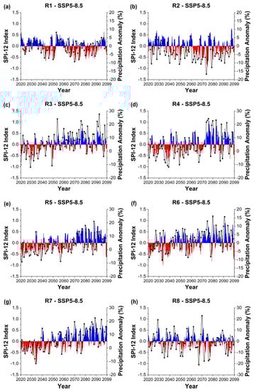 Temporal series (2020–2099) of the SPI-12 index and mean annual precipitation anomalies (black dotted line) relative to 1995–2014 (in percent) projected by the BCSD ensemble under the SSP5-8.5 scenario for eight SA subdomains ((a–h), Figure 1). Red (blue) bars indicate SPI-12 values below (above) zero.