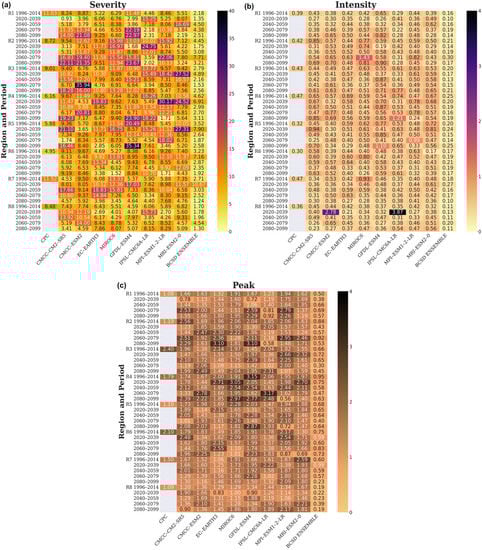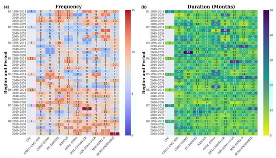In R6 (Southeast region of Brazil), 33 drought episodes have been counted in the period 2020–2099, all belonging to the mild drought category, with the longest-lasting episode from 04/2020 to 01/2026 (70 months), followed by episodes with 61 months (from 12/2035 to 12/2040) and 23 months (11/2032 to 09/2034). Approximately 60% of projected drought episodes are 10 months or longer. Analyses of SPI-1 and SPI-12 in the north and northwest areas of the Rio de Janeiro state for the 1967–2013 period indicated a higher occurrence of events in the moderately and extremely dry categories, as well as a higher frequency of droughts in the two regions of the state during ENSO cycles in both phases of the Pacific Decadal Oscillation [62]. Analyses of drought events in the Paraná River Basin showed that hydrological droughts in the 1981–2021 period were the most severe and intense [33].
