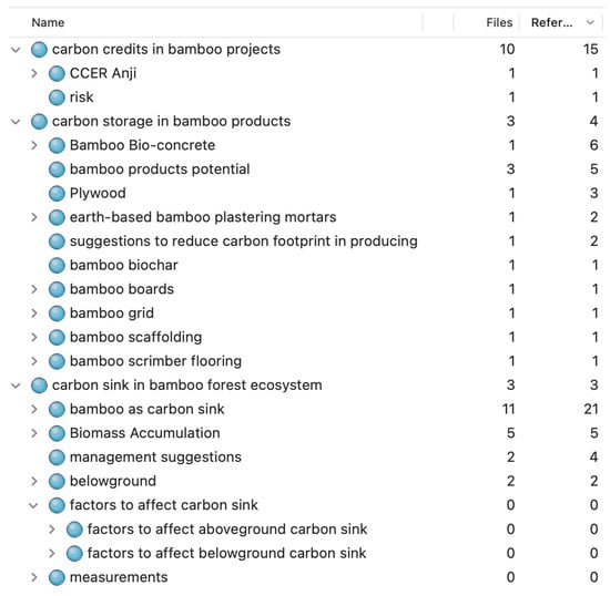 We reviewed the remaining 91 studies in NVivo during step 4, summarizing the evidence based on a thematic analysis following the guidelines of Nowell et al. [26] (Figure 3). With the synthesis and analysis of the larger subject under many themes, this method enabled the generation of themes and the identification of patterns across the bulk of the research papers [27]. Our team thoroughly read most of the research papers and created a rough coding framework. Three broader themes emerged from this analysis, namely, carbon sinks in bamboo forest ecosystems, carbon storage in bamboo products, and carbon credits in bamboo projects. Additionally, several subthemes were defined under the three larger themes (Figure 4). We acknowledge that some papers studying other species might not have been included in our review, but the four databases represented a vast number of peer-reviewed bamboo forestry research articles. With a trustworthy thematic systematic review process established, we ensured that our results would present a general framework of how bamboo species are studied across the globe.