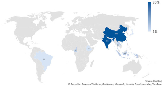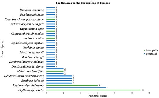We found only 36 bamboo species that were researched for carbon sink function; six monopodial species were studied in 22 papers, while 46 articles analyzed 30 sympodial species (Figure 5). However, there are more than 1600 bamboo species in 121 genera globally [66], and there is a significant lack of research on the remaining species. Moso bamboo (Phyllostachys pubescens) and Lei bamboo (Phyllostachys violascens) are the most studied monopodial species (green bars in Figure 5), and China, especially Zhejiang, is the region where the majority of research was conducted. However, the carbon sink capability of sympodial bamboo species in China remains an under-researched area. Bambusa vulgaris is the most studied sympodial bamboo species, followed by Dendrocalamus membranaceus, Bambusa nutans, Bambusa balcooa, and Bambusa cacharensis, with the research locations mostly in India. The majority of other sympodial bamboo species remain under-researched. The existing research includes countries in Asia that have large areas of bamboo, such as China (with research on Phyllostachys edulis and Phyllostachys violascens) and India (with research on Bambusa cacharensis, Bambusa vulgaris, and Bambusa balcooa) (Figure 6). A total of 35% of the selected studies focused on China, and another 35% focused on bamboo in India. The remaining studies included Laos (7%), Indonesia (7%), and Thailand (3%) in Southeast Asia; Cameroon (6%) and Ethiopia (1%) in Africa; and Brazil (1%) in South America.