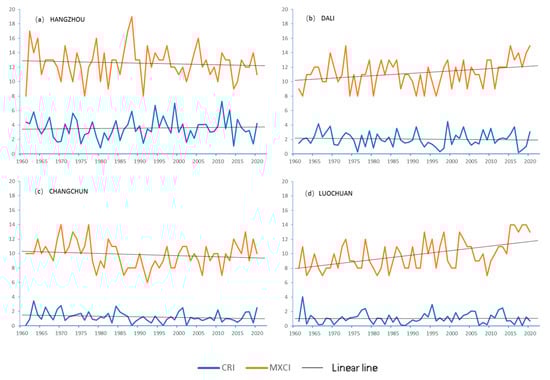 Annual change curves and linear trend (grey line) of MXCI (orange line) and CRI (blue line) in Hangzhou (a), Dali (b), Changchun (c) and Luochuan (d) station from 1961 to 2020.
