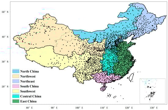 In this study, the average value of 1991–2020 is used to represent the climate state. The linear trend analysis is performed on the data from 1961 to 2020, and the calculated linear trend is tested for significance by using the Mann–Kendall test method []. In order to analyze the variation characteristics of regional extreme events, China is divided into seven regions (as shown in Figure 2), which is mainly based on the rules of geographical location and climate similarity. Specifically, the seven regions are northwest China (include 5 provinces, i.e., Xinjiang, Gansu, Qinghai, Ningxia, and Shaanxi), north China (include 5 provinces or municipalities, i.e., Beijing, Tianjin, Hebei, Shanxi, and Inner Mongolia), northeast China (include 3 provinces, i.e., Liaoning, Jilin, and Heilongjiang), east China (include 7 provinces or municipalities, i.e., Shanghai, Jiangsu, Anhui, Shandong, Zhejiang, Jiangxi, and Fujian), central China (include 3 provinces, i.e., Henan, Hubei, and Hunan), south China (include 3 provinces, i.e., Guangdong, Guangxi, and Hainan), and southwest China (include 5 provinces or municipalities, i.e., Sichuan, Chongqing, Guizhou, Yunnan, and Tibet).