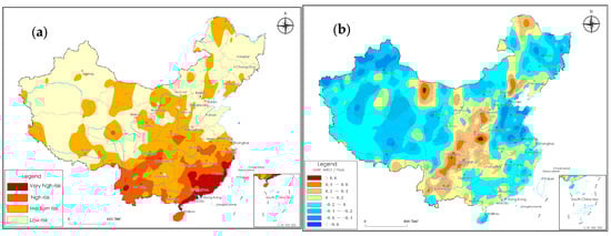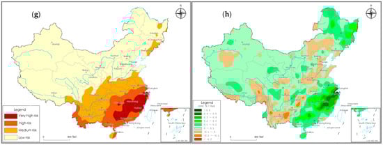 In Equation (9), MXCI is the multi extreme events composite risk grade index and Rht, Rlt, Rdr, Rpr, and Rty are the risk levels of extreme drought event, extreme precipitation event, extreme high-temperature event, extreme low-temperature event, and extreme typhoon event, respectively. In Equation (9), CFmxci is the cumulative frequency of all five extreme events in the same year; then, MXCI was transformed into the composite risk grade index determined by CFmxci in the nationwide comparison, with 4, 3, 2, and 1 denoting very high risk, high risk, medium risk, and low risk, respectively.