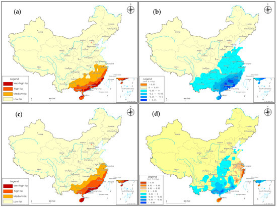 Risk of extreme typhoon events in China in the 30 years from 1991 to 2020 (extreme typhoon wind speed events (a) and extreme typhoon precipitation (c)) and the linear trend of annual frequency of extreme typhoon events in the 60 years from 1961 to 2020 (extreme typhoon wind speed events (b) and extreme typhoon precipitation (d); the tilt-line-covered areas indicate statistically significant test pass at the 95% confidence level. Unit is %/10a in (b,d)).