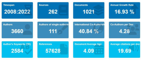 Figure 1 shows the bibliometric statistics indicating the timespan, sources, number of documents, authors, etc. This statistical overview of documents from 262 sources helps synthesize the research domain’s scientific analysis. Figure 2 shows the scientific production concerning citations retrieved from 2008 to 2022. Biblioshiny was used for the bibliometric analysis plots because it provided the web interface for bibliometrix.
