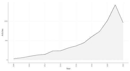 Figure 2 shows that the scientific production of articles increased gradually from 2008 to 2021. Afterwards, article production declined steeply from 2021 to 2022, which could be attributed to the COVID-19 pandemic. Table 3 shows the detail annual scientific production of articles.