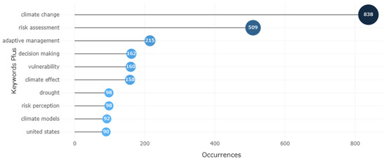Figure 3 shows the top 10 most frequent words in the documents, which include climate change (838), risk assessment (509), adaptive management (215), decision making (162), vulnerability (160), climate effect (158), drought (98), risk perception (98), climate models (92), and the United States of America (90).