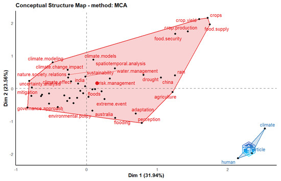 Figure 3 shows that most authors’ top concerns are climate change (838) and risk assessment (509). This suggests that “climate change” is the most frequent word in the dataset. Further analysis was required to understand the underlying structures in the dataset; thus, the Multiple Correspondence Analysis (MCA) was conducted. This analysis represented the data set as points in a two-dimensional space. The strength of association applied in constructing the bibliometric map allowed various scientific maps to be prepared, showing the dynamic nature of the data obtained from the scientific research. Figure 4 shows the conceptual structure map based on the Multiple Correspondence Analysis (MCA) method.