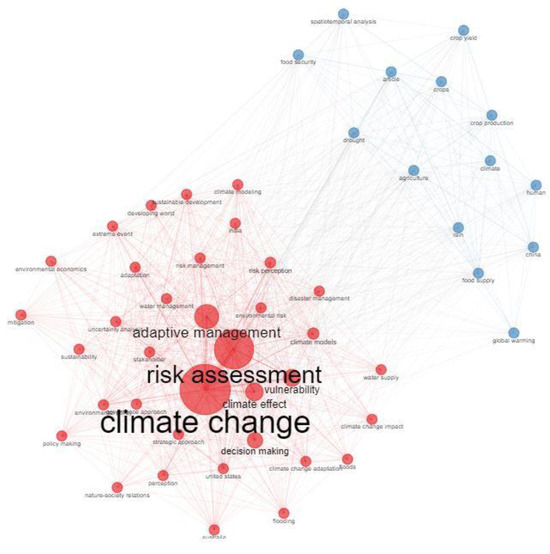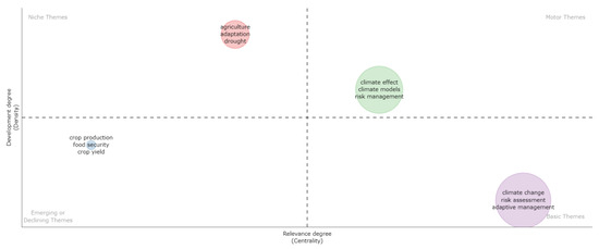 Figure 4 shows cluster 1 (red colour), consisting of themes including extreme events, adaptation, drought, climate models, climate modelling, risk management, climate effect, and many more. Cluster 2 (blue colour) is the most significant, consisting of themes including humans and climate. The conceptual structure puts data with multiple variables onto a low-dimensional space, creating a two-dimensional graph with plane distance to show similarity between themes. Themes or keywords approaching the centroid of a cluster indicate that they have received a lot of attention from research [133]; those near the edge are topics that have received minimal attention or were incorporated into other topics [134]. The thematic analysis clusters authors’ keywords and their interconnections, thereby providing the themes, characterized by density and centrality. The density is shown on the vertical axis, while centrality is also on the horizontal axis. Centrality represents the degree of correlation among different topics; density also measures the nodes’ cohesiveness. Thus, the density and centrality measures show how well a topic is developed. Moreover, the higher the number of relations in a node with others in the thematic network, the higher the centrality and importance.